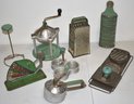 LOT (8) VINTAGE MID 20TH CENT GREEN HANDLED KITCHENWARE UTENSILS - GRATERS, JUICERS, SCALE ETC - SEE PHOTOS - WEAR & IMPERFECTIONS