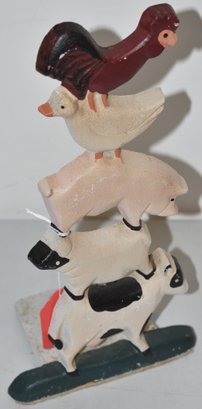 20TH CENT PAINTED CAST IRON DOORSTOP OF ANIMALS STACKED FROM COW, SHEEP, PIG, DUCK & CHICKEN -11" T - WEAR