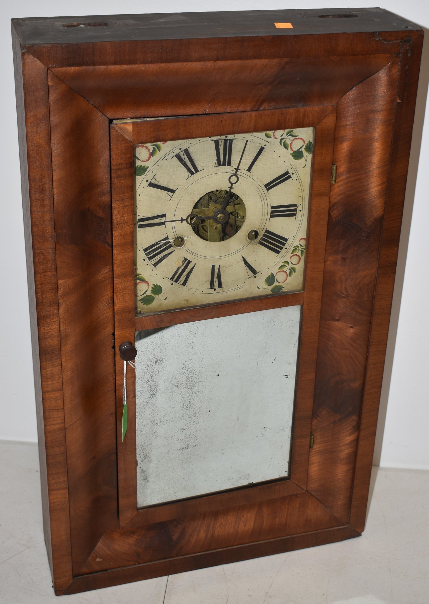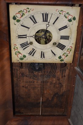 PAINTED WOODEN DIAL & BRASS WORKS - LABEL INSIDE - 26 1/4" X 16" - WEIGHTS & PENDULUM - WEAR & IMPERFECTIONS