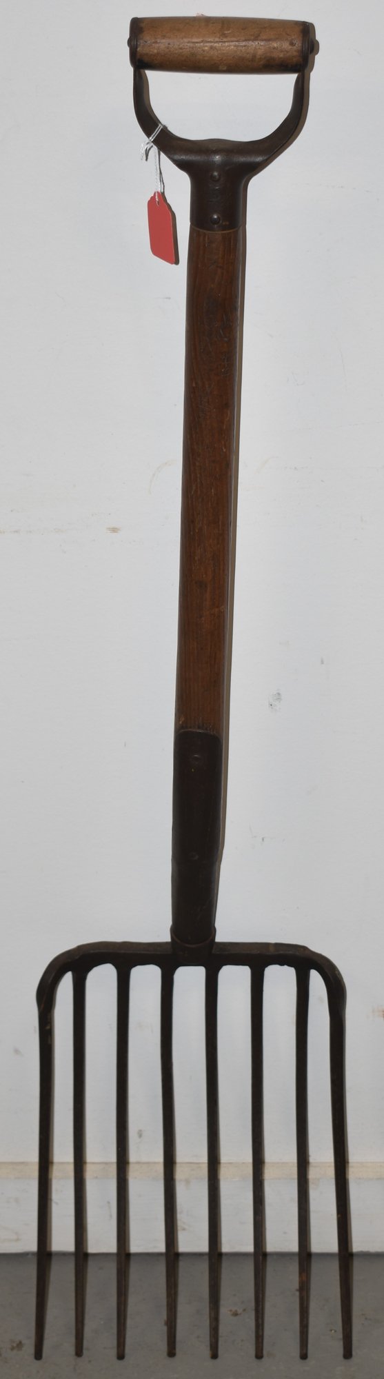 43 1/2" IRON PITCHFORK W/ WOODEN SHAFT & HANDLE - HANDLE MARKED THE I.D.L. - WEAR & IMPERFECTIONS