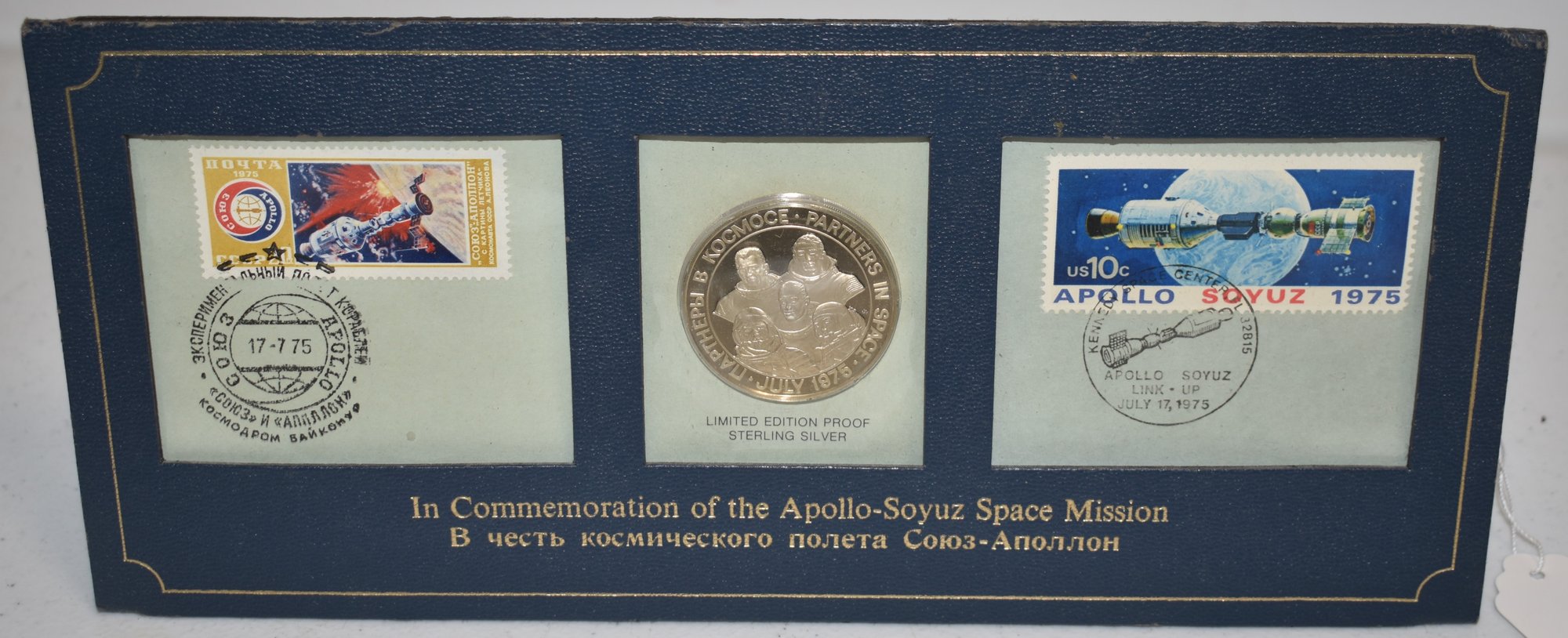 1975 APOLLO - SOYUZ SPACE MISSION STERLING COIN & STAMP SET - WEAR