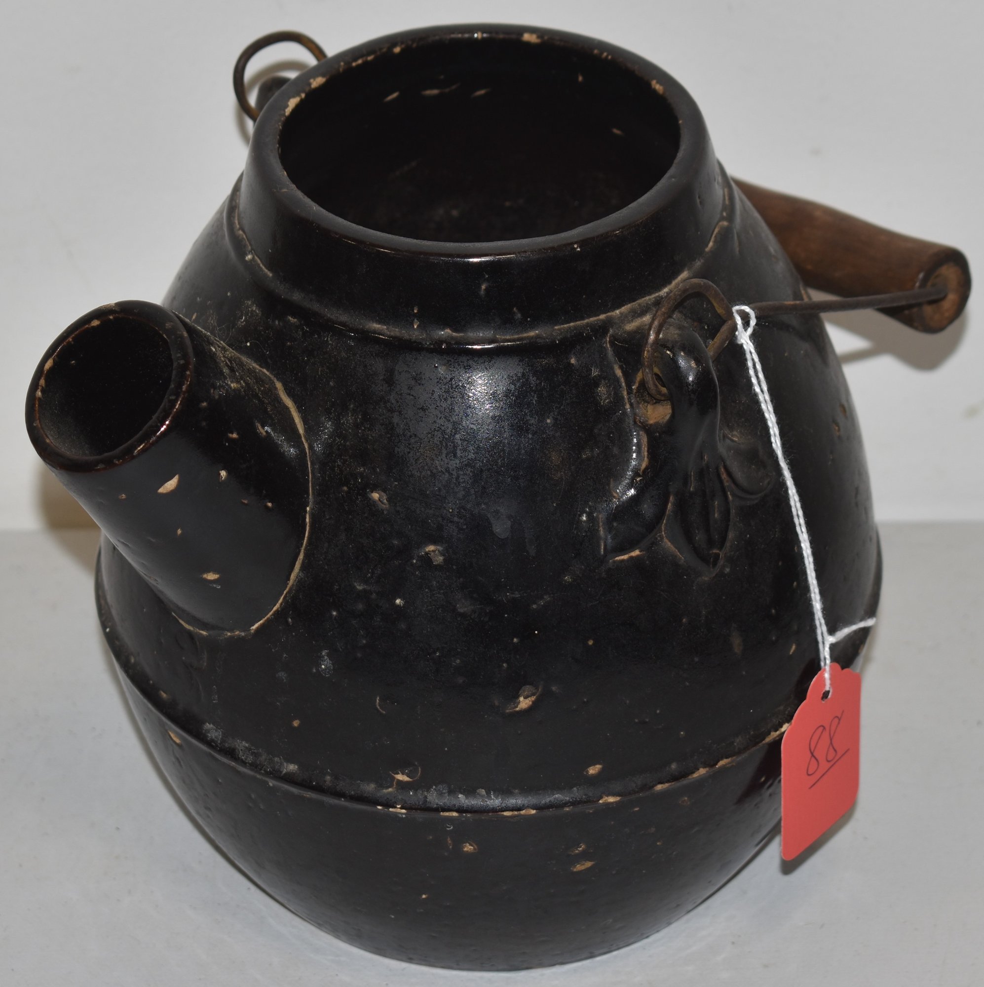 7 1/2" BROWN BATTER PITCHER W/ BAIL HANDLE - WEAR & IMPERFECTIONS