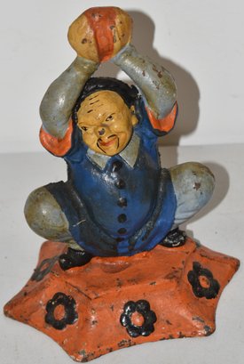8 1/2" PAINTED CHINESE MAN CIRCUS JESTER W/ BALL DOORSTOP - GOOD & BRIGHT & BOLD ORIGINAL PAINT - WEAR