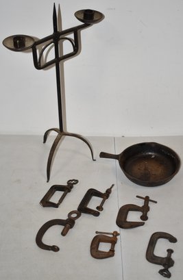 NO. 3 6 5/8" SKILLET, (5) IRON CLAMPS & WROUGHT IRON 2 LITE CANDLESTICK - WEAR