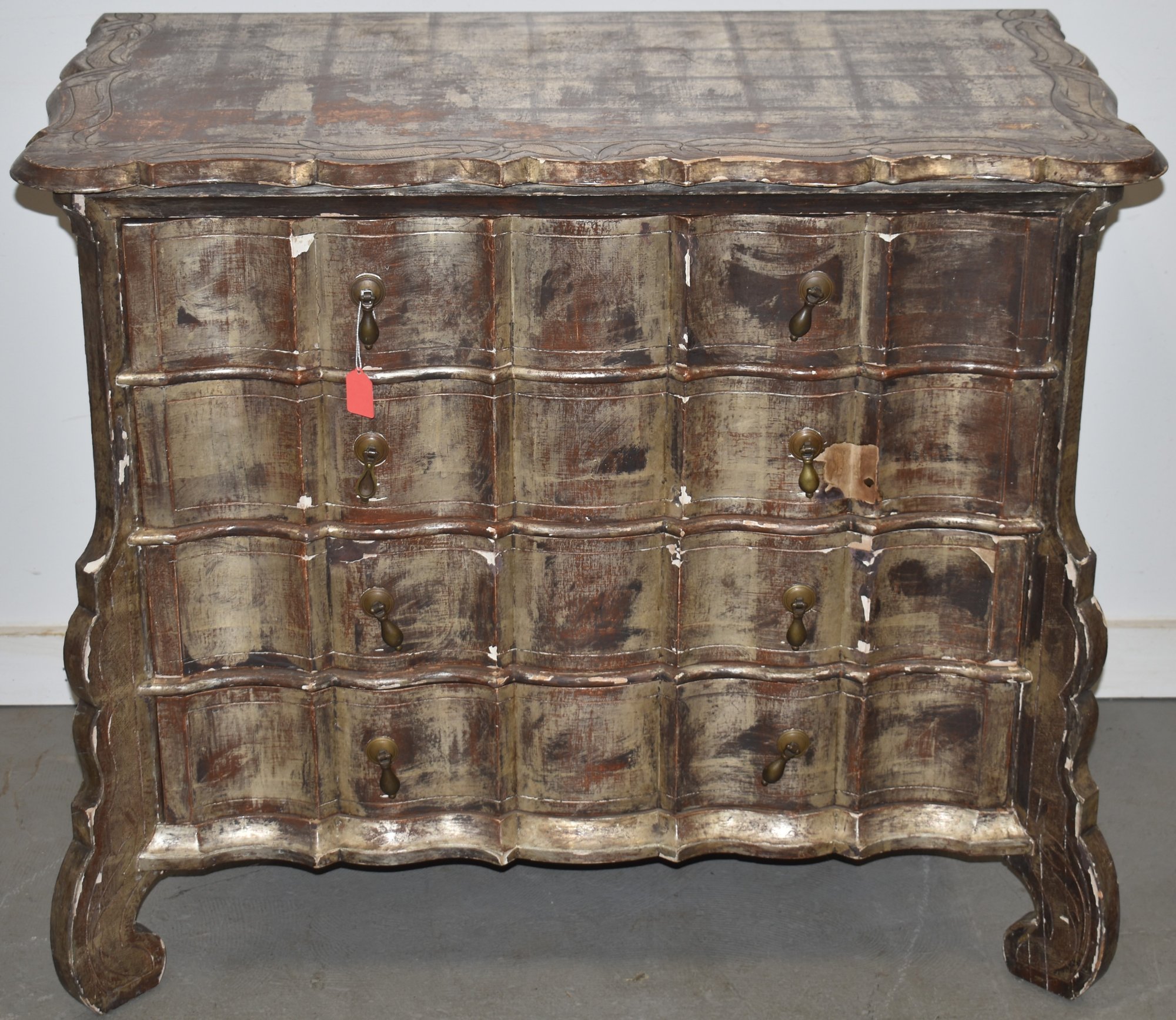 PAINTED DECORATIVE SHAPED FRONT OAK 4 DRAWER CHEST - 33" T X 37" W X 19 1/2" D - WEAR & IMPERFECTIONS