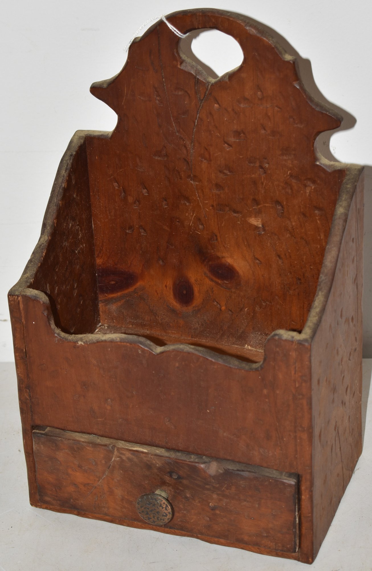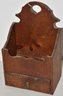 PRIMATIVE PINE 1 DRAWER WALL BOX W/ SHAPE BACK CREST - 14" T X 8 1/2" W X 5 1/2" D - WEAR & IMPERFECTIONS