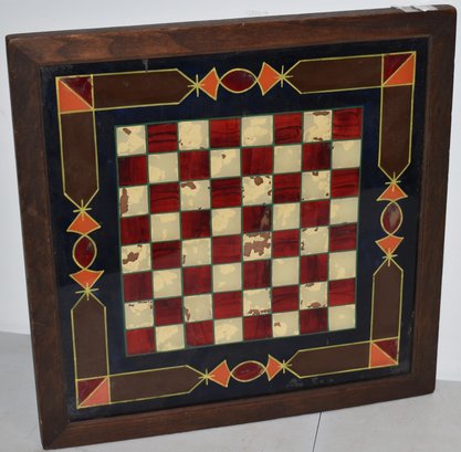 FRONT SIDE REVERSE PAINTED ON GLASS CHECKER - BOARD(FRAMED) BASKESIDE PAINTED WOODEN GAMEBAORD - 16 3/4" SQ. - WEAR, LOSSES TO PAINT & IMPERFECTIONS