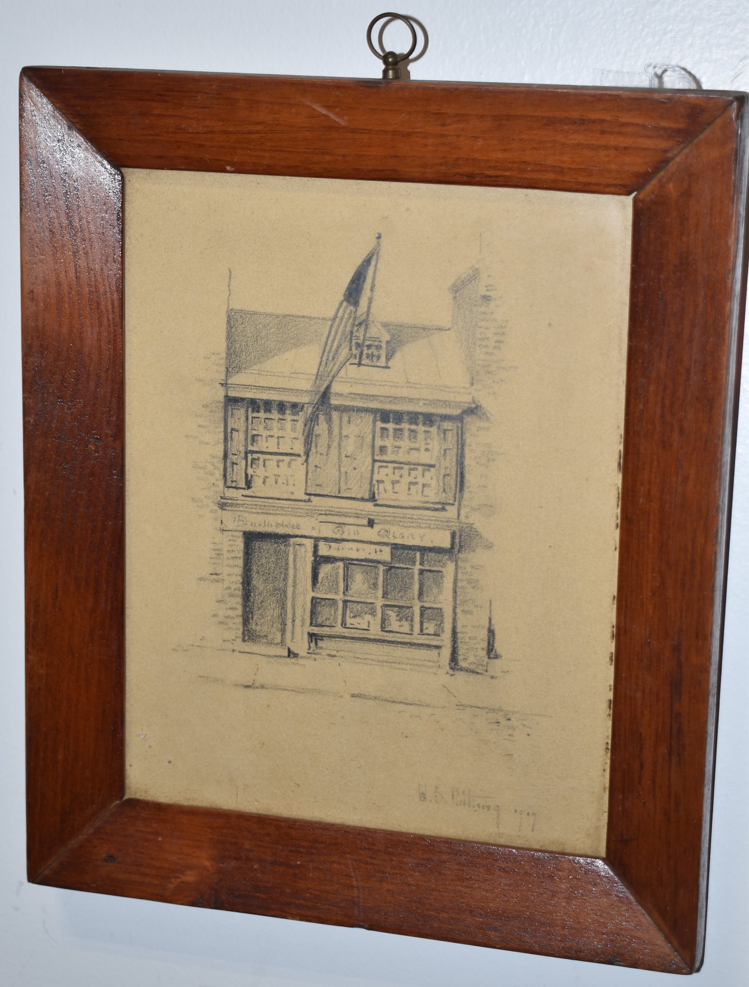 STORE FRONT FLYING AMERICAN FLAG - SIGNED W.B. PORTING? 1919 - 8 1/2" X 6 1/2" SIGHT - TONING & WEAR
