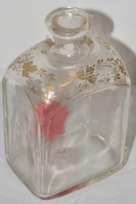 EARLY BLOWN DECANTER W/ GILT VINTAGE PATTERN DECORATION ON SHOULDER - NO STOPPER - OPEN PONTIL - 5" T X 2 3/4" W X 2" D - WEAR & IMPERFECTIONS
