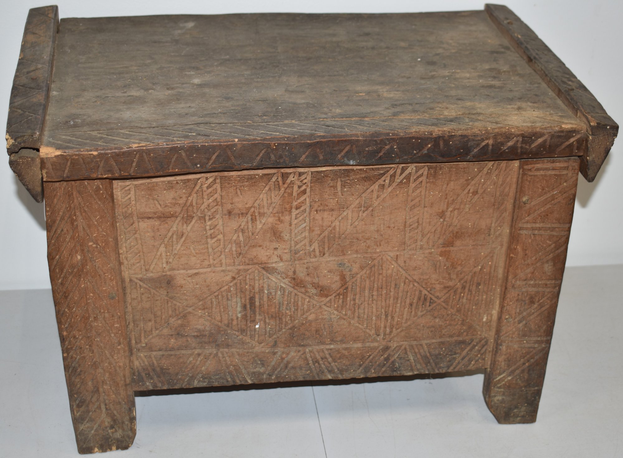 EARLY CONTINENTAL CARVED WOODEN FLAT - TOP BOX W/ HINGED TOP - 22" L X 13 3/4" W X 14" T - WEAR, WORN HOLES & IMPERFECTIONS
