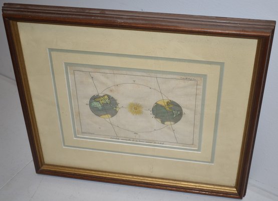 HAND COLORED FRENCH BOOK PLATE - EARTHS ANNUAL ORBIT AROUND THE SUN - GRAVE PAR P. BOUGOIN - 6" X 9" SIGHT - MATTED & FRAMED - TONING, CREASING & WEAR