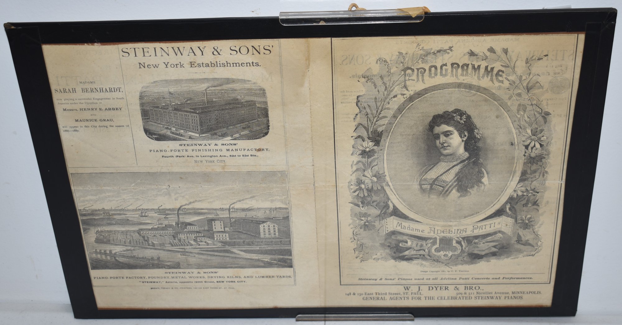 MADAME ADELINA PATTI W/ STEINWAY & SONS ADVERTISING - UNDER GLASS FRAME - W.J. DYER & BRO - MINNEAPOLIS - ST. PAUL - 11 1/2" X 17" SIGHT - TONING & WEAR