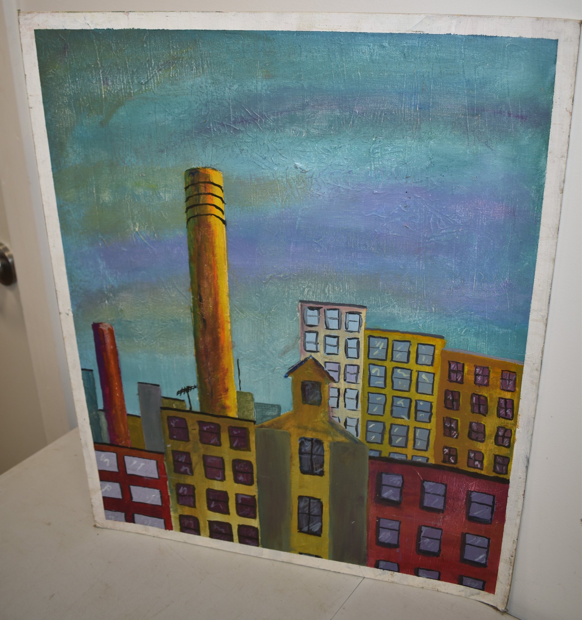 20TH CENT OIL PAINTING OF FACTORIES ON CANVAS BOARD - UNFRAMED - 30" X 24" - WEAR