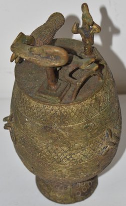 8 1/2" TALL ETCHED & CUT FIGURAL BRASS PEDALSTALED COVERED URN - WEAR & IMPERFECTIONS