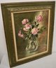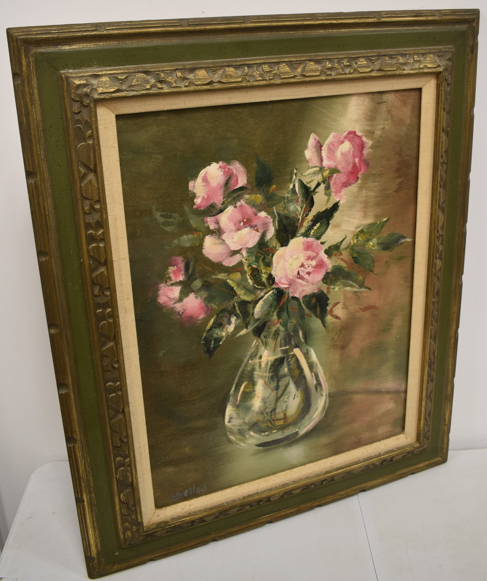 20TH CENT OIL PAINTING ON CANVAS OF PINK ROSES IN A VASE SIGNED BROSLAU LOWER LEFT - 23 1/2" X 17 12/" SIGHT - FRAMED - SOILING & WEAR