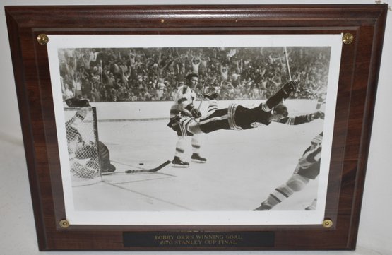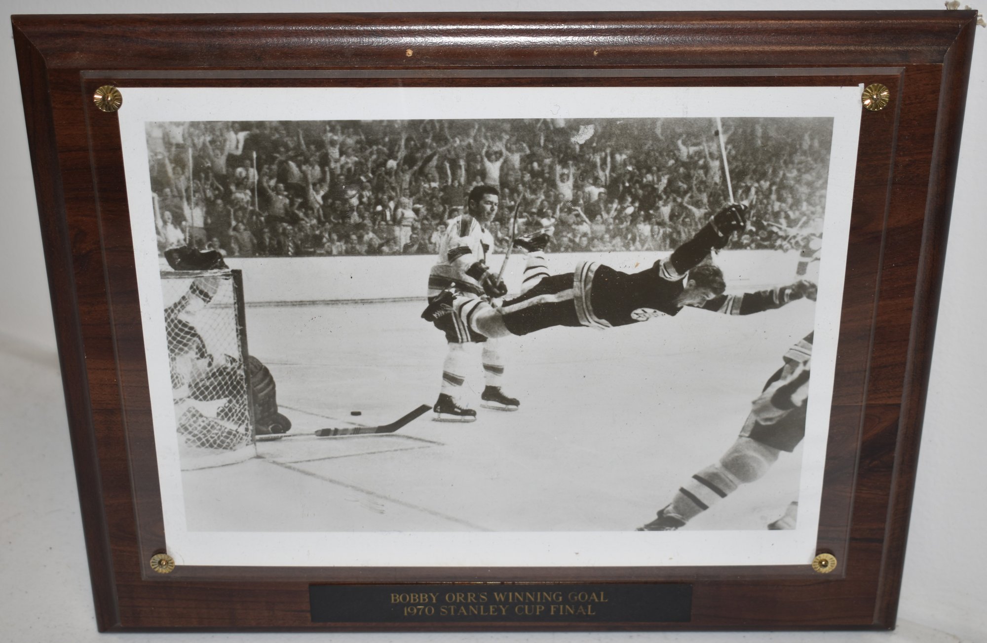 BOOBY ORRS WINNING GOAL 1970 STANLEY CUP FINAL - HPTO 7 3/4" X 1-" - [LAQUE 10 1/2" X 13" - WEAR