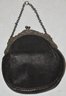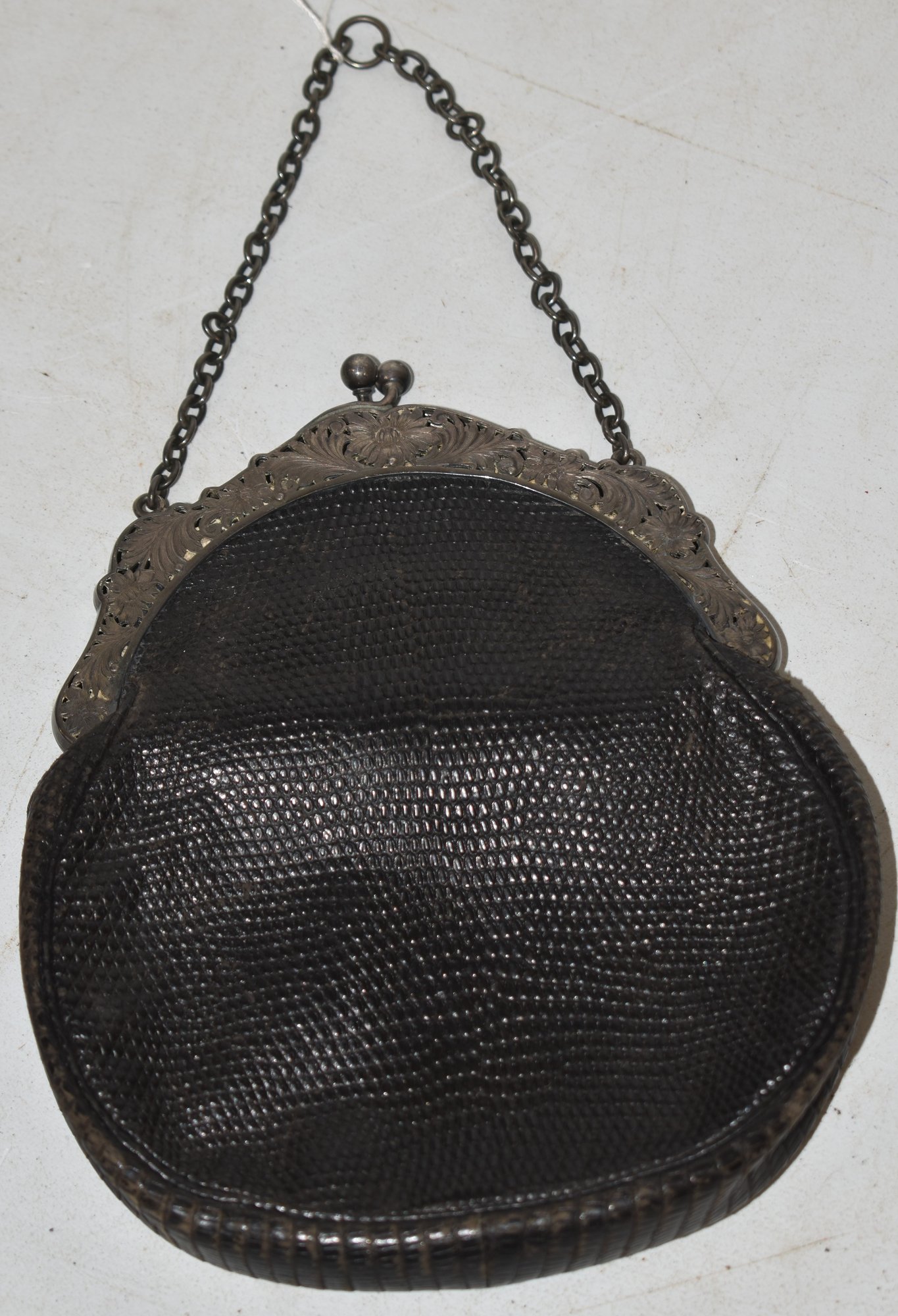 BLACK LEATHER PURSE W/ CHASED SILVER PLATED TOP RIM, CLASP & CHAIN - STAMPED J.E. CALDWELL & CO PHILA INSIDE - PURSE 7 1/4" X 6" - WEAR