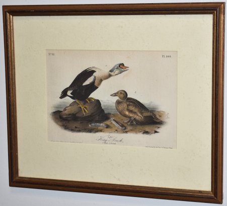 KING DUCK LITHO DRAWN FROM NATURE BY J.J. AUDUBON - PUBLISHED BY J.J. BOWEN PHILA - PI. 404 - 5" X 7" SIGHT - MATTED & FRAMED - TONING & IMPERFECTIONS