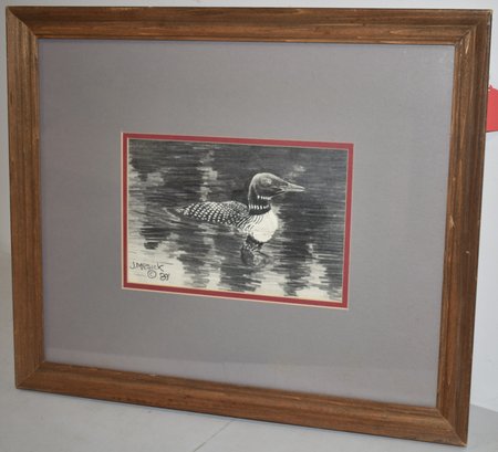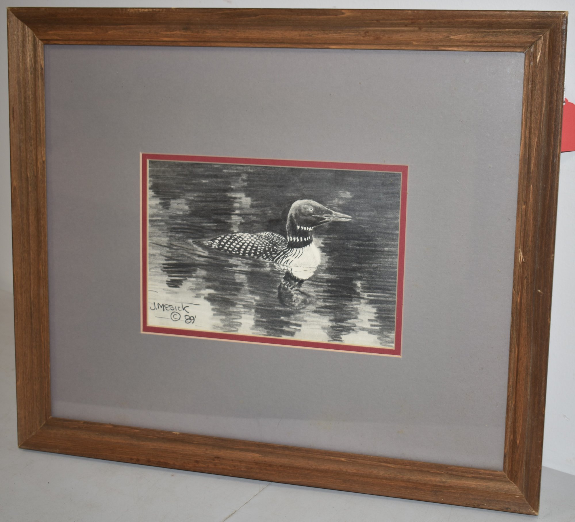 CHARCOAL DRAWING OF A LOON - SIGNED J. MESICK ( JACK MESICK) 89' - 6" X 8 3/4" SIGHT - MATTED & FRAMED