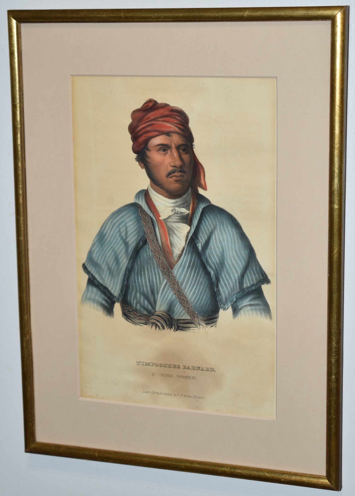 19TH CENT COLORED LITHOGRAPH TIMPOOCHE BARNARD CHEIF OF THE YUCHI INDIANS - PUBLSIHED BY J.T. BOWN - 9 1/4" X 5 3/4" SIGHT - MATTED & FRAMED - TONING & IMPERFECTIONS