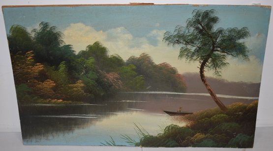 LAKE LANDSCAPE OIL PAINTING ON ARTSIT BOARD MOUNTED ON WOOD PANEL - SIGNED LESLIE HOOPER LOWER LEFT - 16 3/4" X 27" - UNFRAMED - WEAR & IMPERFECTIONS