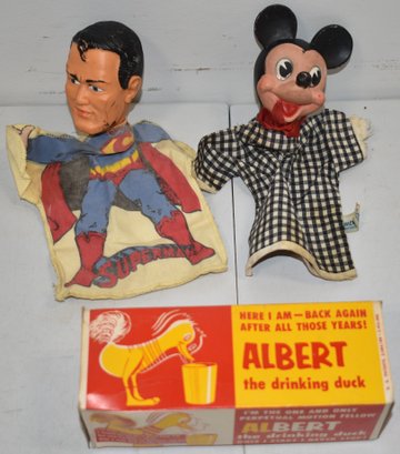(2) HAND PUPPETS - MICKEY MOUSE & SPIDERMANM TOGETHER W/ ALBERT THE DRINKERS DUCK W/ ORIGINAL BOX - WEAR & IMPERFECTIONS