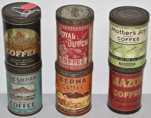 (6) VINTAGE COFFEE TINS - VARIOUS BRANDS - 6" & 6 1/4" X 4" ROUND - WEAR & IMPERFECTIONS