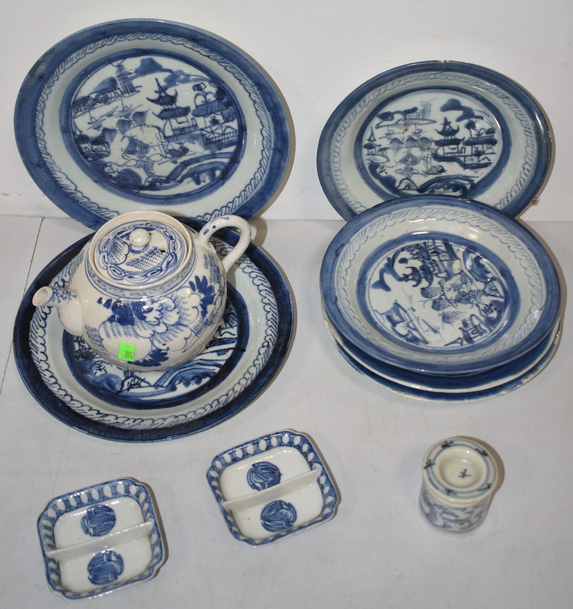 (4) 7 1/4" & 8 3/4" BLUE CONTON PLATES, SM. BULBOUS TEA POT, SM. BLUE & WHITE BOX & (2) SM. DIVIDED DISHES - WEAR