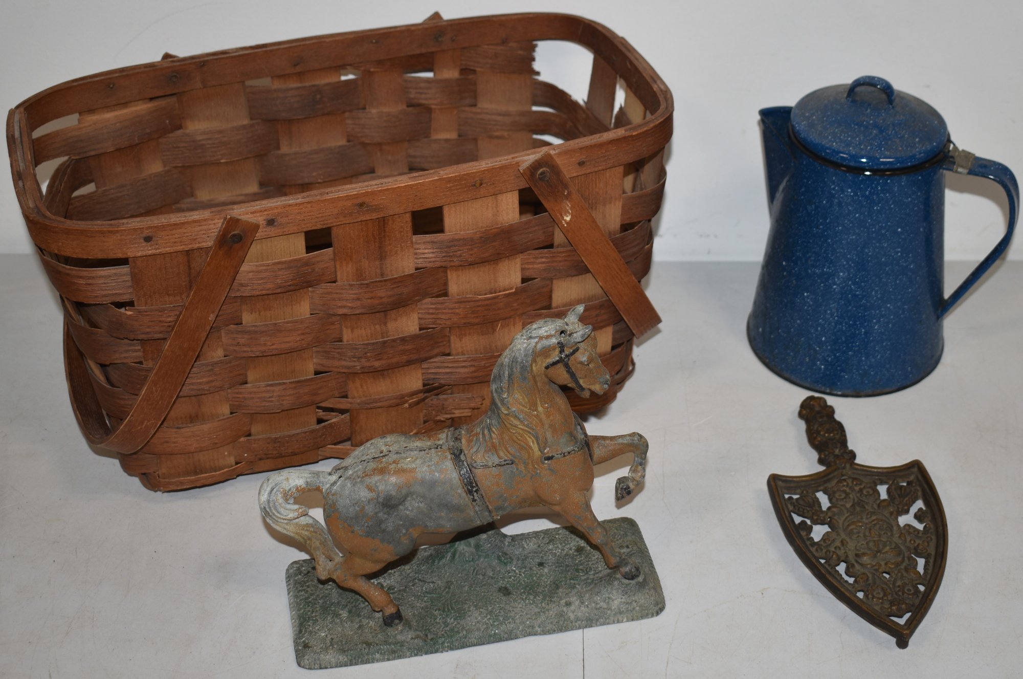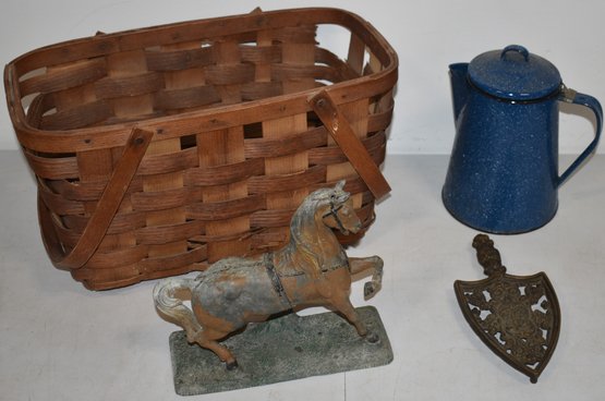 BLUE ENAMEL COFFEE POT, IRON TRIVET, SPELTZER HORSE & SPLINT BASKET (LOSSES) WEAR & IMPERFECTIONS