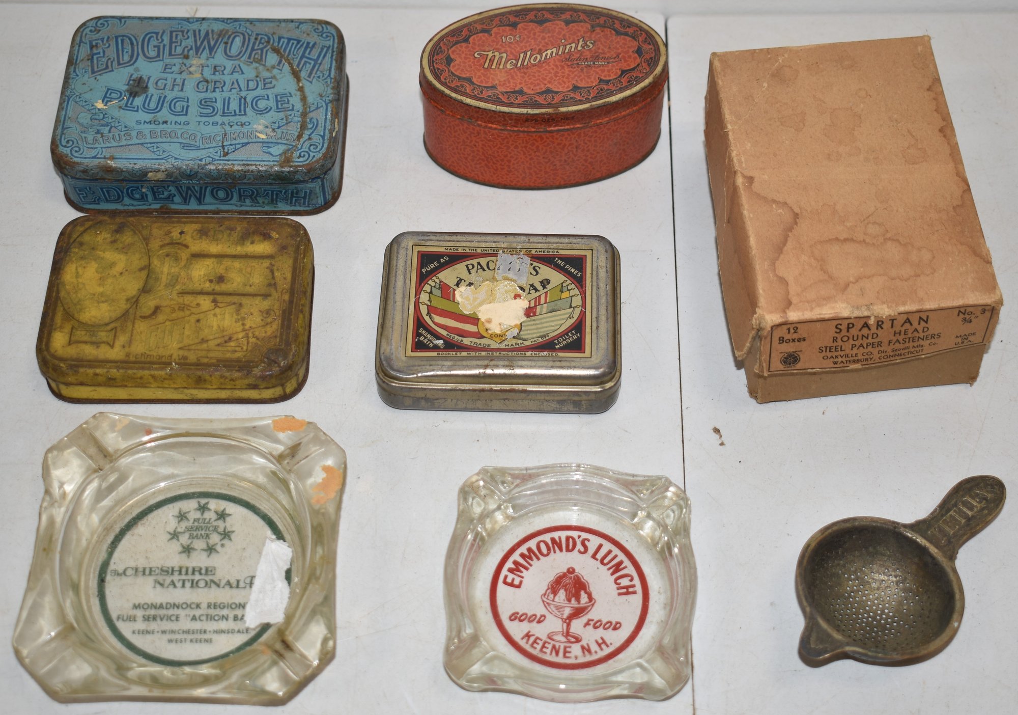 TINS. ASHTRAYS, TEA STRAINER, VINTAGE STEEL PAPER FASTNERS W/ ORIGINAL BOX ETC - WEAR