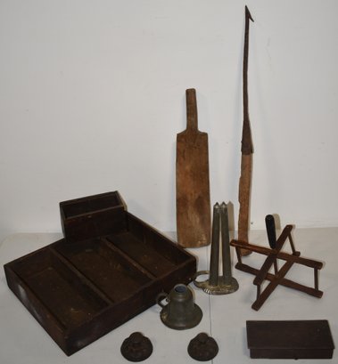 LOT INCLUDES WOODENWARE, BOXES, PADDLE, YARN WINDER, TRAY, TIN CANDLE MOLD, PEWTER FINGER LAMP & IRON SPEAR W/ WOODEN HANDLE - WEAR & IMPERFECTIONS