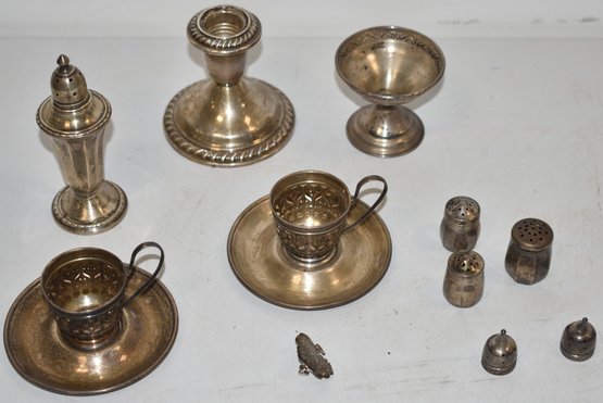 SHAKERS, DEMI CUPS/ SAUCERS, WEIGHTED CANDLESTICK & SHAKER - 11.57 TROY OZ - WEAR