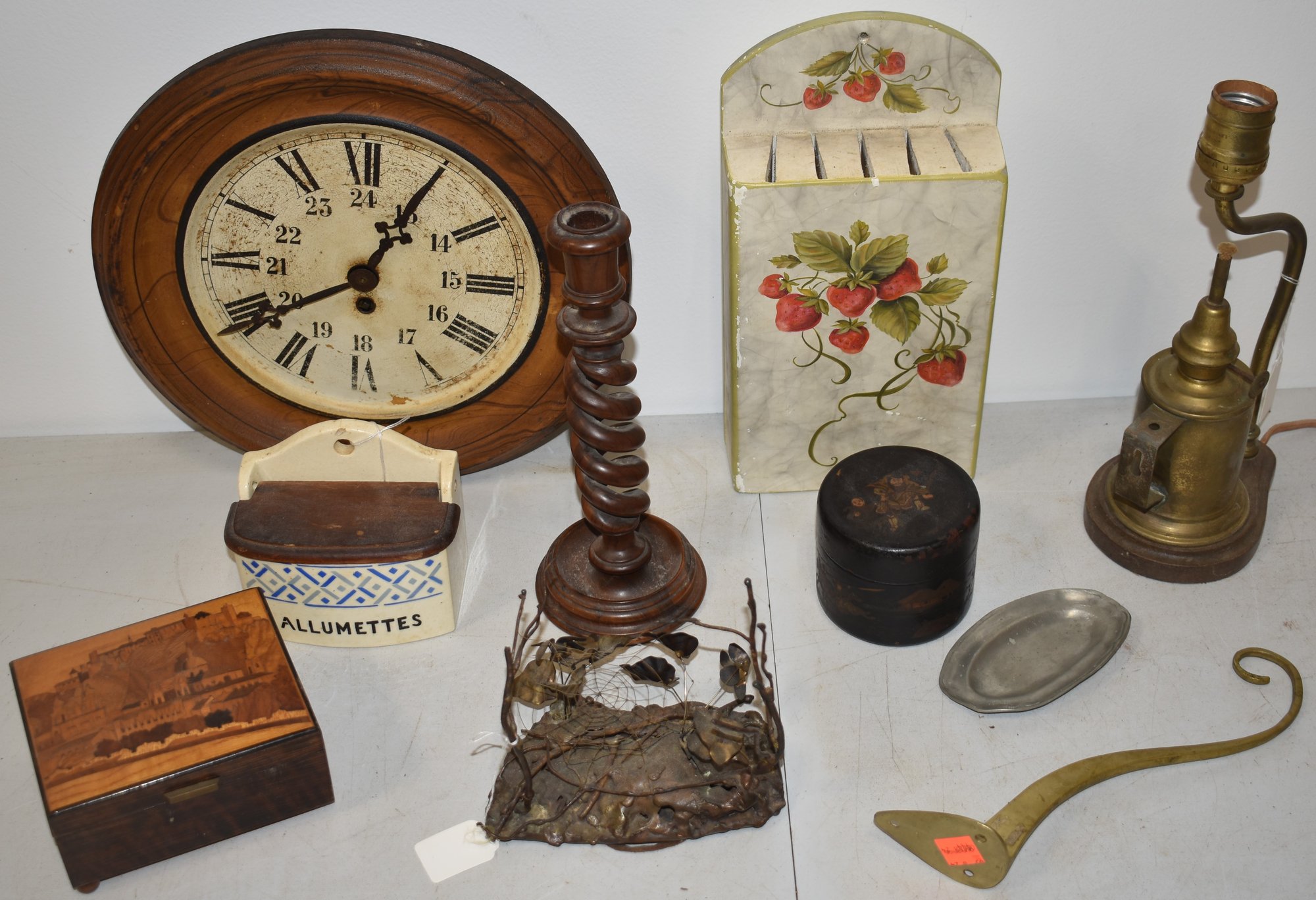 LOT INCLUDES WALL BOX, INLAID MUSIC BOX (MISSING FOOT), BRASS LAMP, WALL CLOCK, KNIFE BOX, WOODEN C'STICK, BRASS ITEMS ETC