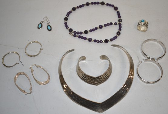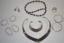 LOT OF VINTAGE STERLING JEWELRY NECKLACES (1W/ AMYTHYST), EARINGS, BRACELETS ETC - ONE MARKED STERLING OR .925 - IMPERFECTIONS