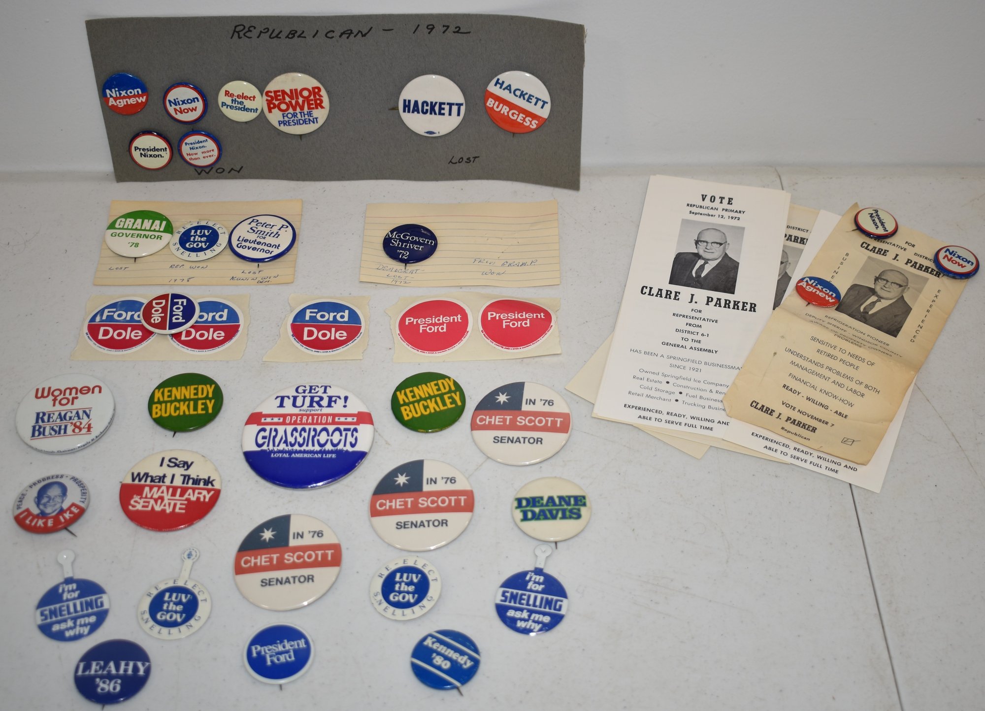 LOT VINTAGE POLITICAL PINBACK BUTTONS, STICKERS & PAPER