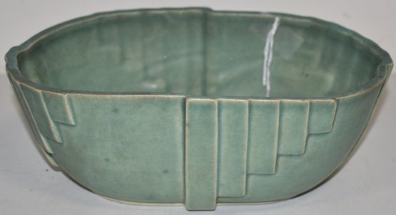 ENGLSIH MATT GREEN ART DECO POTTERY BOWL - 9 1/4" L X 5 3/4" W X 3 1/4" T - MARKED MADE IN ENGLAND BOTTOM - WEAR & IMPERFECTIONS