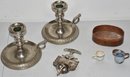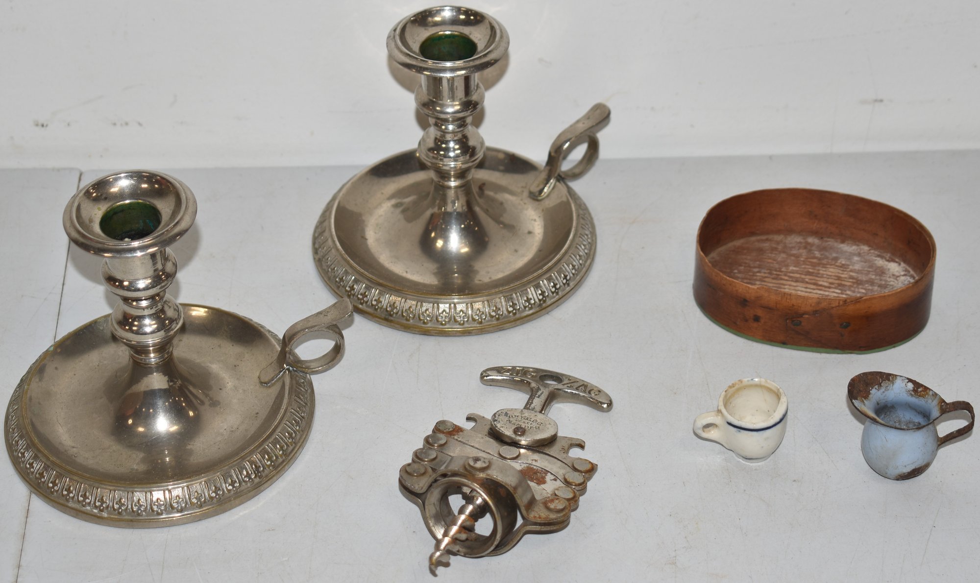 PR. SILVER PALTED CHAMBERSTICKS, SM. 4" OVAL FINGERED BOX (NO LID). 1 1/2" ENAMEL PITCHER & ZIG ZAG (CORKSCREW) - WEAR & IMPERFECTIONS
