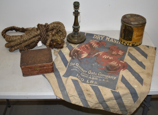 LOT INCLUDES - BRASS CANDLE STICK, SUNSHINE MARTINI BUTTER CRACKER, FLEMISH ART BOX - 10 FT LENGTH OF ROPE, 100 LBS SACK FOR FUL - O -PEP DRY MASH - WEAR & IMPERFECTIONS