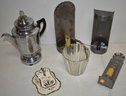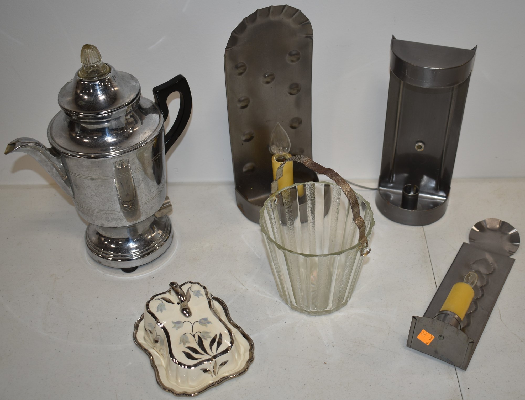 TIN ELECTRIC WALL SCONES, IVE BUCKET, SHEESE OR BUTTER DISH & CHROME COFFEE POT (MISSING CORD) - IMPERFECTIONS