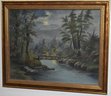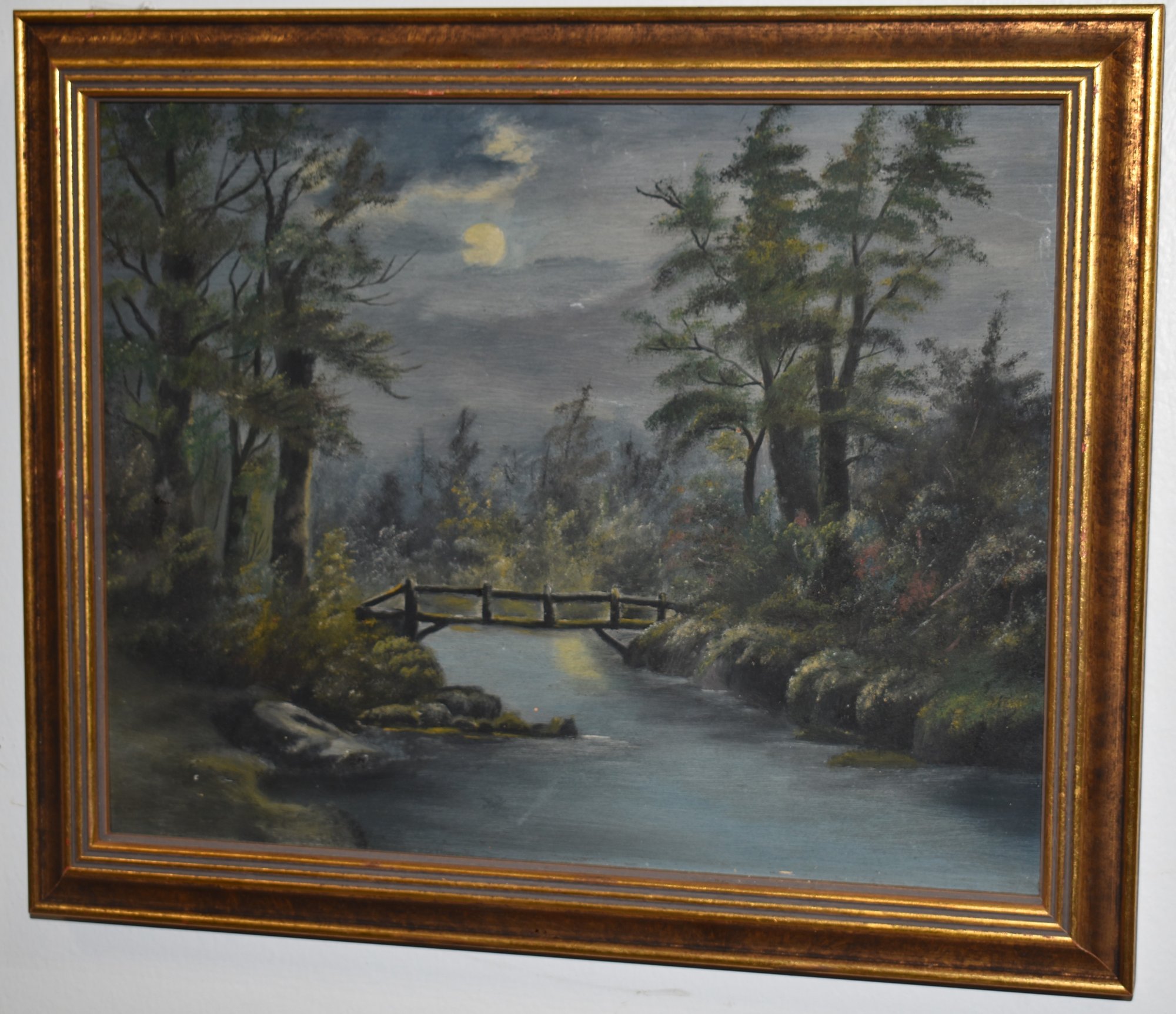 STREAM W/ WOODEN BRIDGE AT NIGHT - UNSIGNED 7 3/4" X 10" SIGHT - FRAMED - WEAR