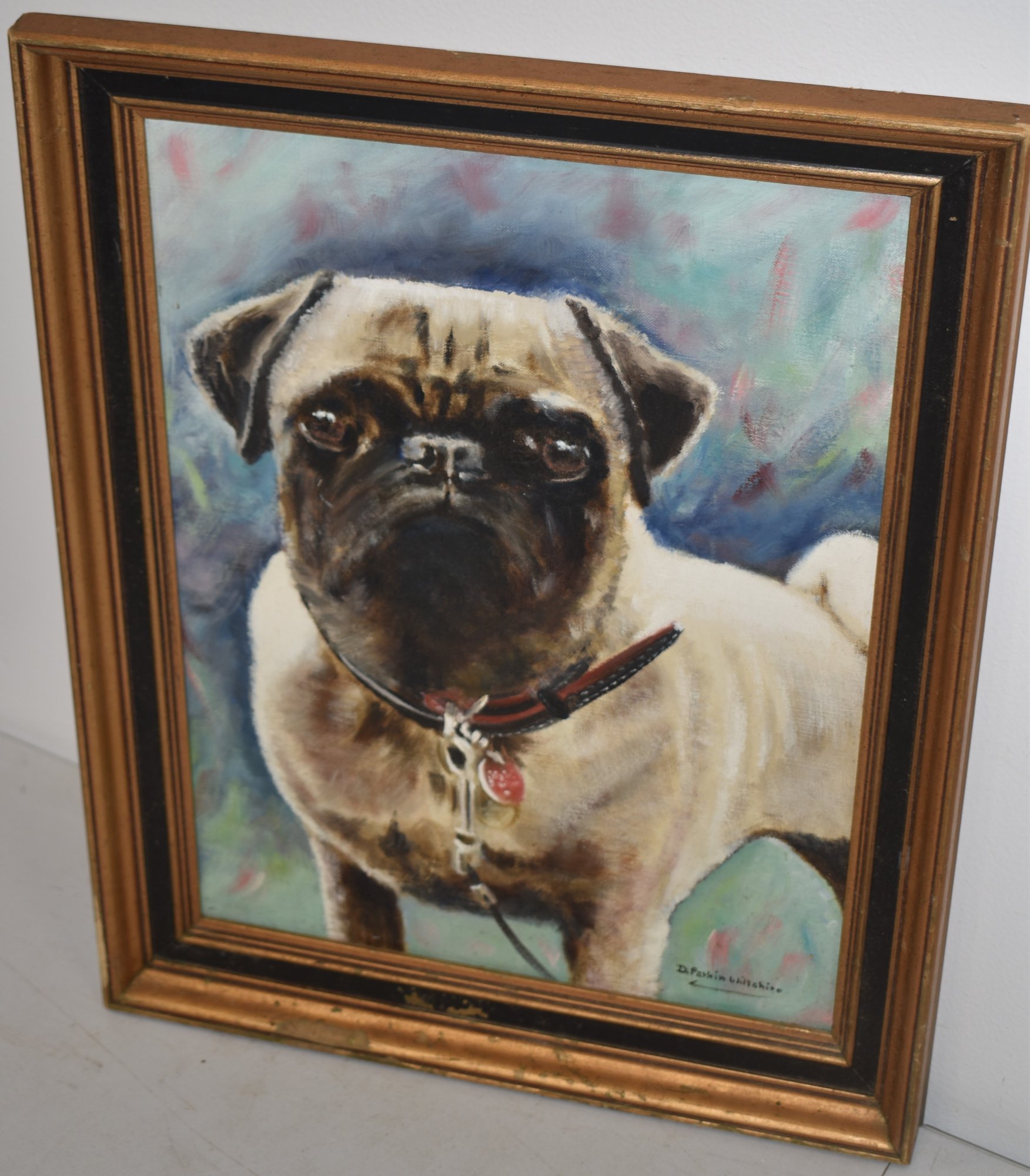 20TH CENT OIL ON CANVAS OF A PUG ON LEASH - SIGNED D. PARKIN WILLSHIRE LOWER RIGHT & BACK - TITLED BOSLEY LANLEY - DATED 1987 - WEAR