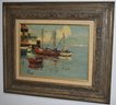 20TH CENT OIL ON CANVAS OF HARBOR SCENE SIGNED THARK LOWER LEFT - CONTINENTAL ART GALLERY LABEL ON BACK - 11 1/2" X 15 1/2" SIGHT - MATTED & FRAMED - WEAR