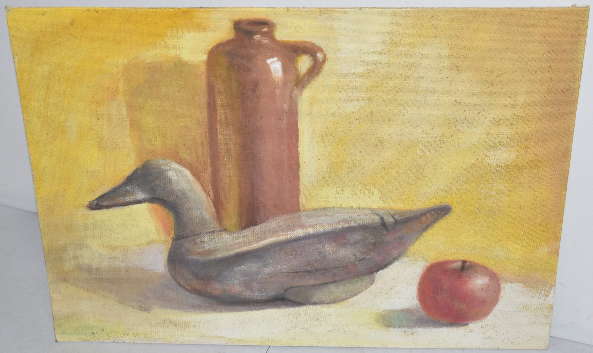 UNFRAMED OIL ON CANVAS BOARD OF A DUCK DECOY W/ TONEWARE BOTTLE & APPLE - UNSIGNED - 11 3/4" X 15 3/4" - IMPERFECTIONS