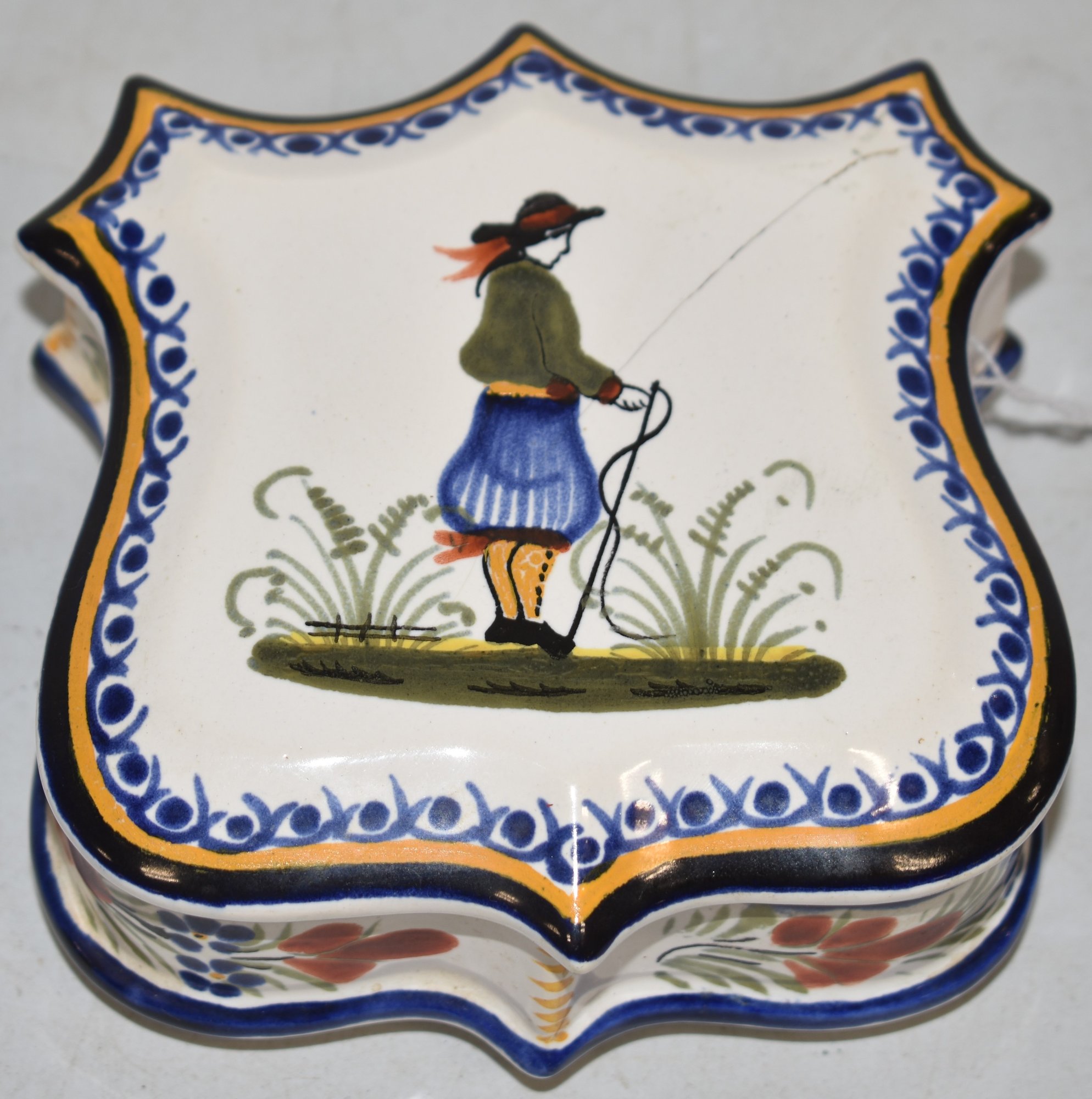 SHIELD SHAPED COVERED BOX MARKED HENRIOT QUIMPER FRANCE - 5" C 5" - LID DAMAGE, WEAR & IMPERFECTIONS