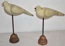 PR. 20TH CENT CARVED WOODEN 14 1/2" DOVES ON STANDS - 14 1/2" L X 16 1/2" ON STANDS - DAMAGE TO BEAKS ON BOTH BIRDS - WEAR & IMPERFECTIONS