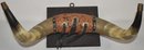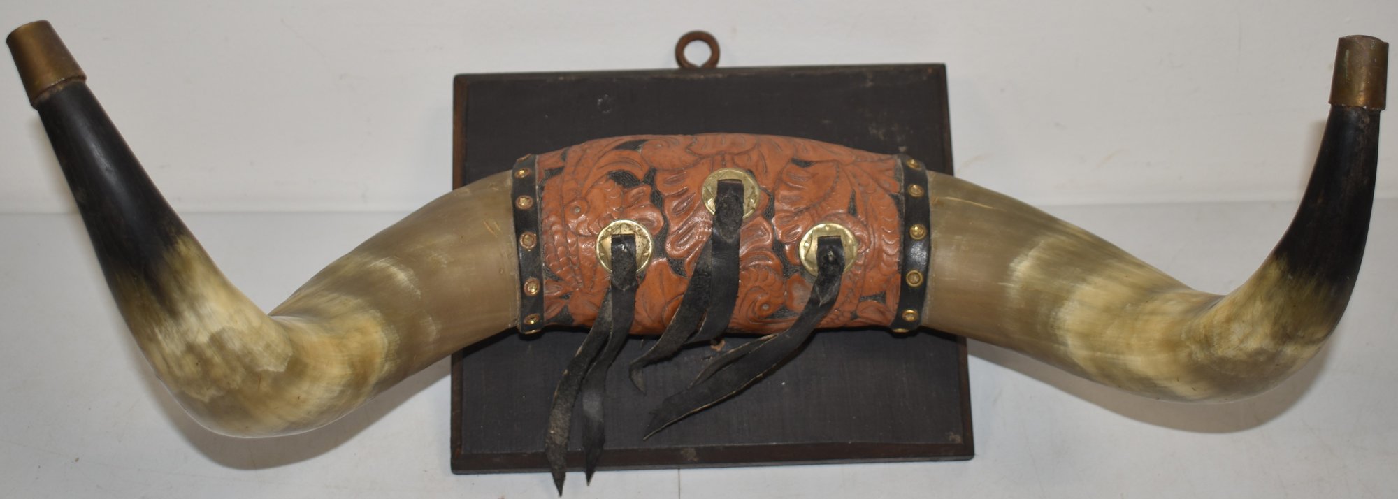 11" STEER HORNS MOUNTED ON WOODEN PLAQUE - 18" ACROSS - WEAR & IMPERFECTIONS