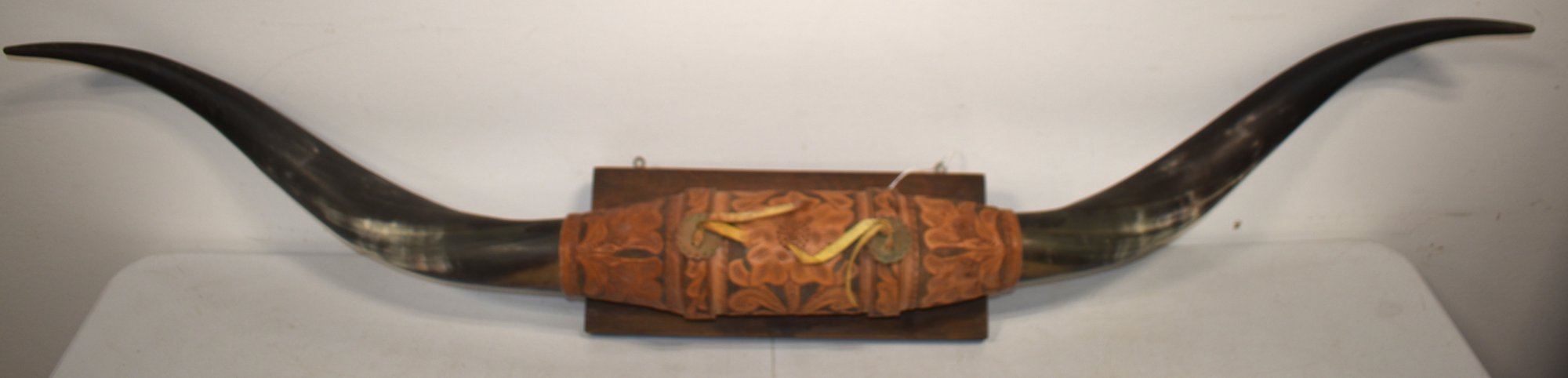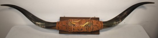 50" STEER HORNS MOUNTED ON WOODEN PLAQUE - WEAR & IMPERFECTIONS