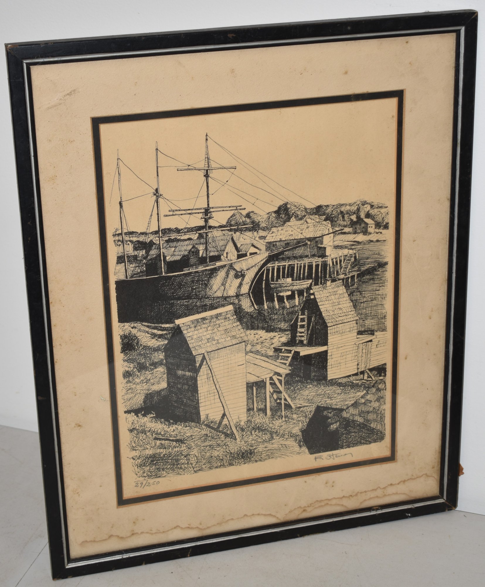 VITNAGE 20TH CENT DOCKYARD SCENE ETCHING SIGNED R. STEINER & NUMBERED 29/250 IN PENCIL LOWER MARGIN - 15" X 11" - MATTED & FRAMED - STAINS LOWER MATT, TONING & IMPERFECTIONS