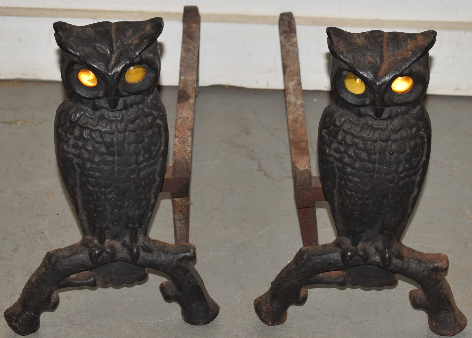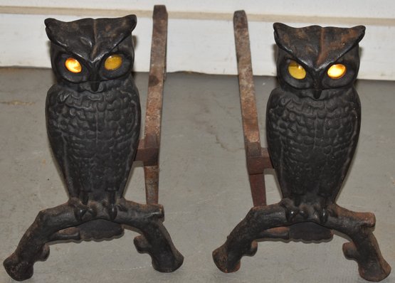 CAST IRON FIGURAL ANDIRONS W/ GLASS EYES - 13" T X 17 1/2" L - WEAR & IMPERFECTIONS