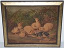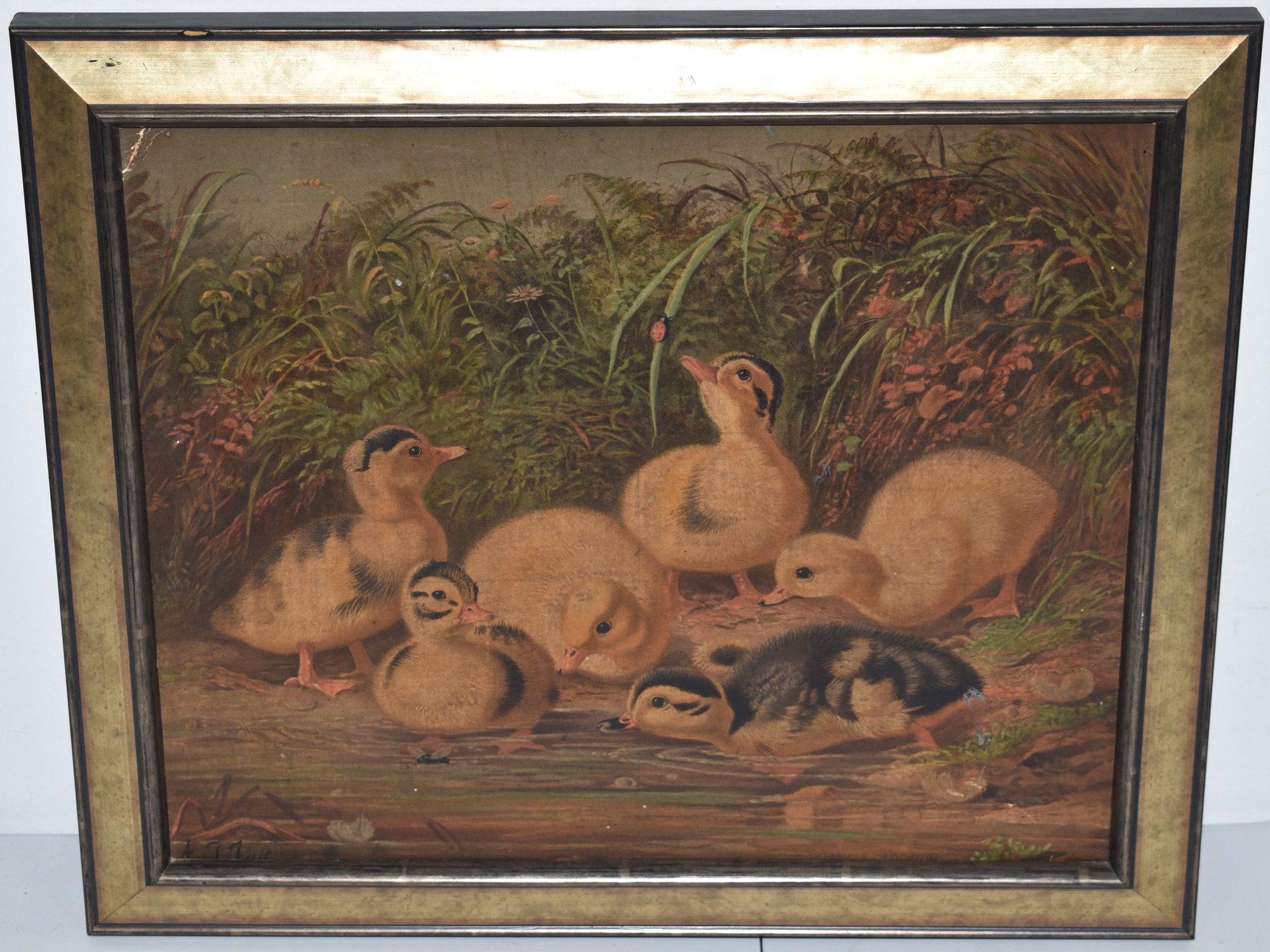 L. PRANG & CO LABEL ON BACK - TITLED " DUCKLINGS" - 10" X 12" SIGHT - FRAMED - IMPERFECTIONS